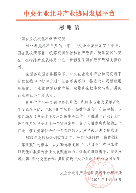 近日,金年会官方体育登录入口机电技术应用研究所收到中央企业北斗产业协同发展平台发来的感谢信,对金年会官方体育登录入口作为平台副理事长单位,2022年在参与重大课题研究、年度成果评优、“北斗时空智能产品数字展会”产品申报、场景汇编及《央企北斗应用》编审等工作方面提供的技术支撑和大力支持表示衷心感谢。